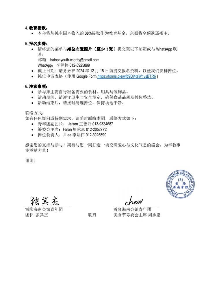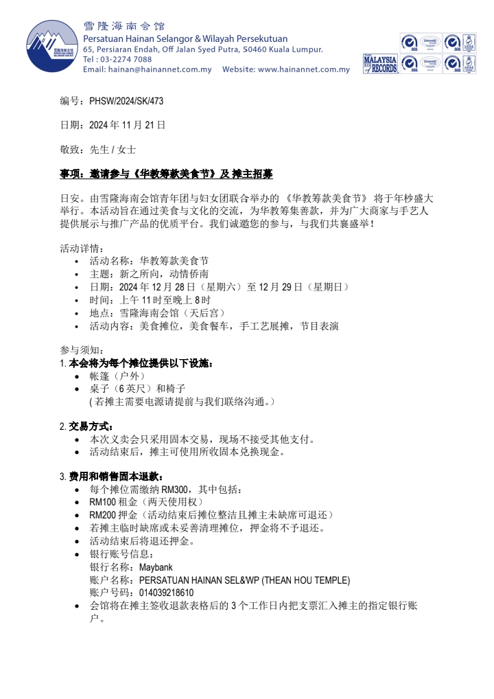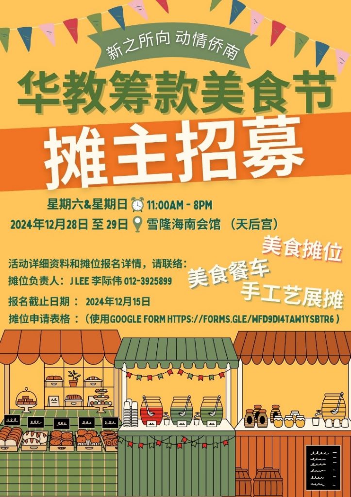 您好!由雪隆海南会馆青年团与妇女团联合举办的 《华教筹款美食节》 将于年底盛大举行。本次活动旨在通过美食与文化的交流,为支持华文教育筹集善款,并为广大商家与手艺人提供展示与推广的优质平台。我们诚邀您的参与,与我们共襄盛举!